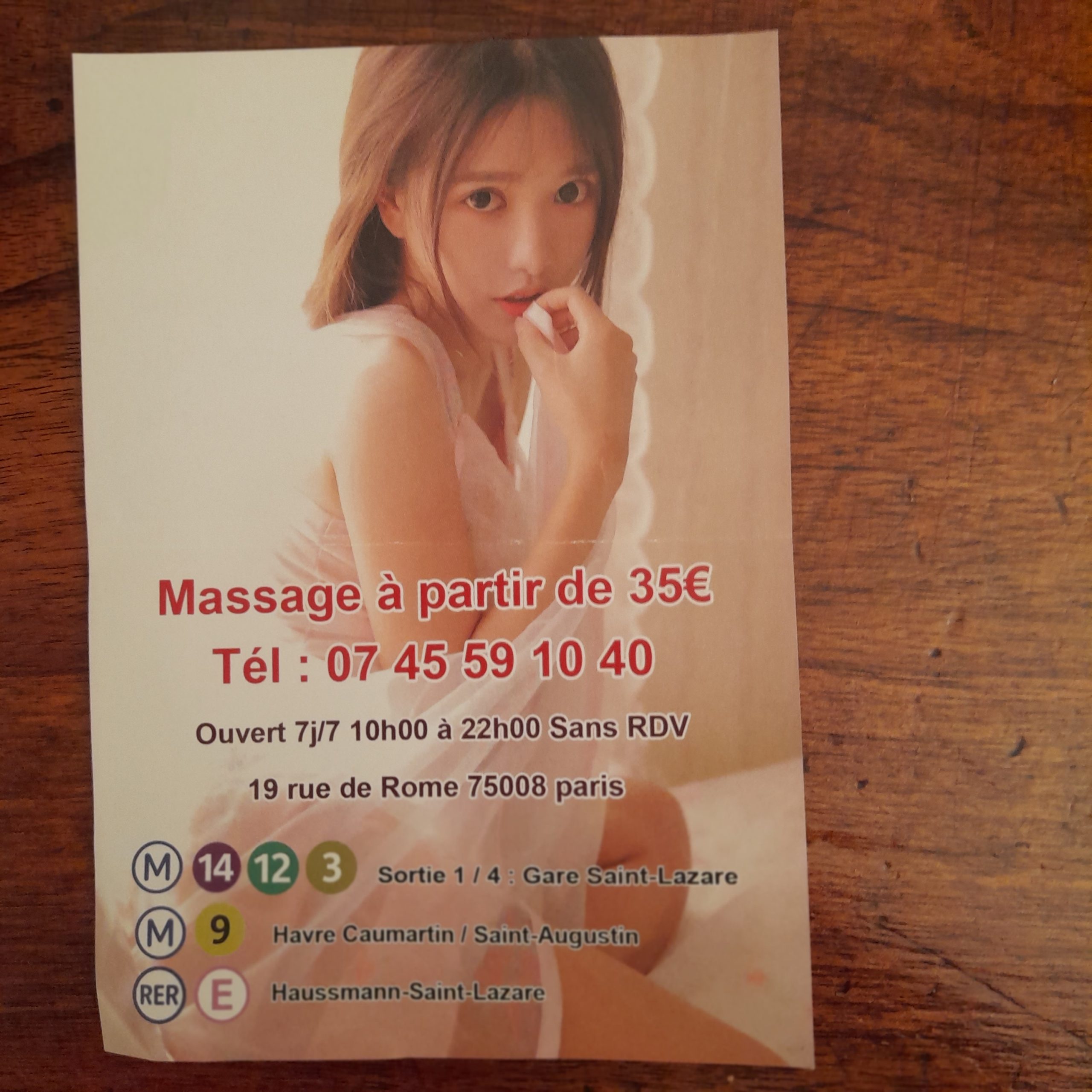 Le texte accompagnant cette image est « Massage à partir de 35€ », suivi d’un numéro de téléphone, des horaires d’ouverture, d’une adresse à Paris ainsi que des coordonnées des transports en commun permettant d’y accéder.