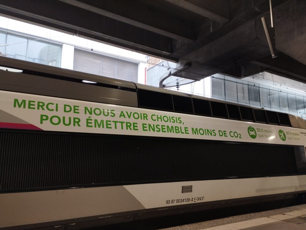 La même critique peut être faite à la publicité apposée sur les motrices de la SNCF, dont l’annonceur indique qu’elle comporte la mention « *Lors d’un voyage à bord d’un train à grande vitesse, sur un trajet longue distance en France, vous émettez 50 fois moins de gaz à effet de serre (GES) qu’en faisant le trajet en voiture partagée et 80 fois moins qu’en avions. ». D’ailleurs, la SNCF, qui n’a pas pris part à la séance, n’a pas soutenu que cette mention ne figurait que sur des équipements roulants utilisés pour des trajets pour lesquels le ratio est d’au moins 80.