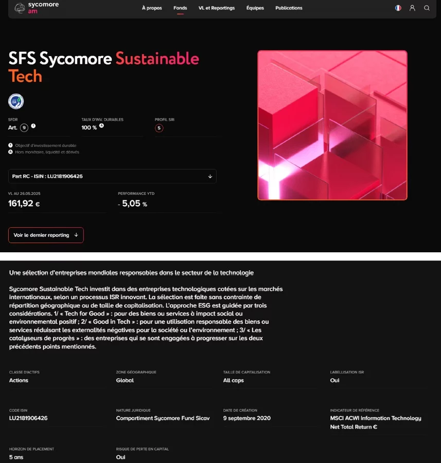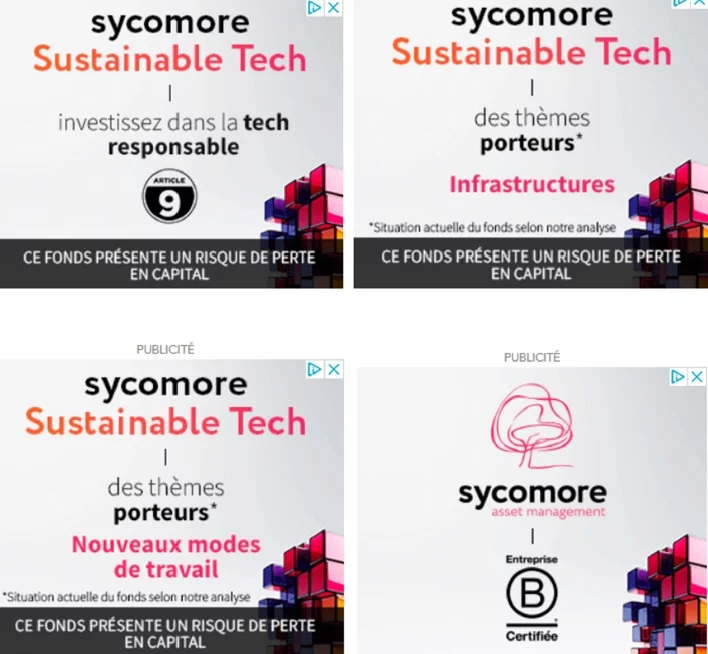 La publicité en cause, diffusée sous forme de bannière animée, sur le site Internet l’infodurable.fr, utilise notamment les allégations « Investissez dans la tech responsable » et « Sycomore Sustainable Tech ».