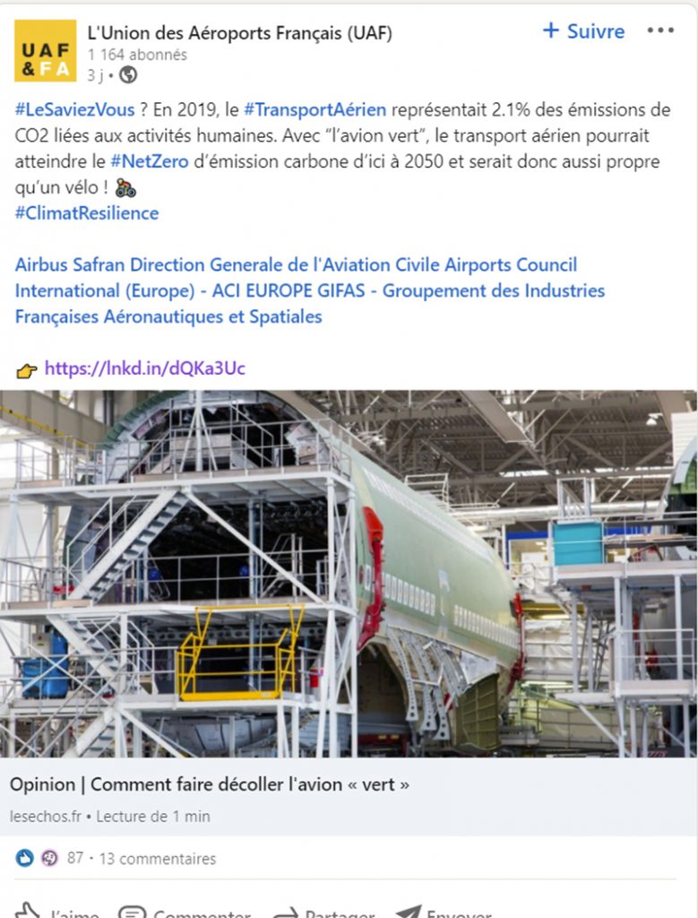 Un autre plaignant relève que l’élément publicitaire visé est un post LinkedIn qui a été publié par l’Union des Aéroports Français fin mars 2021 et a été modifié depuis sa version originale pour faire disparaitre la phrase litigieuse. Il est trompeur d’affirmer que le transport aérien pourrait être « aussi propre qu’un vélo » en 2050. A supposer même que l’avion, en 2050, n’émettrait pas de gaz à effet de serre pendant le vol, celui-ci nécessite d’être construit. Or les émissions de gaz à effet de serre à la construction de l’avion sont naturellement bien supérieures à celles de la construction d’un vélo. De même, les infrastructures et la phase amont nécessaires au fonctionnement du transport aérien (aéroports, conditionnement du carburant) sont largement plus dommageables pour l’environnement que le vélo. Ainsi, le transport aérien ne peut pas être qualifié de « propre », ni aujourd’hui, ni en 2050.