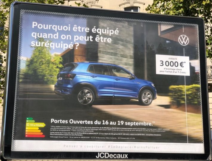 Le texte accompagnant cette image énonce « Pourquoi être équipé quand on peut être suréquipé ? », ainsi que différentes mentions relatives à une offre tarifaire promotionnelle et à l’organisation de portes ouvertes. Les informations imposées par la réglementation, relatives à l’étiquette CO² et au message renvoyant aux mobilités actives sont insérées au bas de l’affiche.