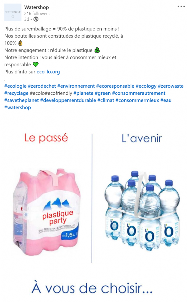 Ces messages présentent deux packs de six bouteilles d’eau présentés côte à côte. A gauche, le pack est emballé d’un plastique de couleur rose sur lequel est écrit « plastique party ». Au-dessus, figure l’inscription « Le passé ». Le pack d’eau de marque L’O, représenté à droite, est intitulé « L’avenir ».