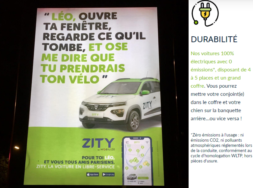 Ici, l’annonceur, qui propose un service de location automobile de courte durée, n’est pas tenu par la loi d’afficher ces messages de promotion des mobilités actives et des transports en commun. Cependant, la promesse de durabilité affichée sur la page d’accueil du site de Zity est en complète contradiction avec l’accroche de cette publicité, qui met l’accent sur l’inconfort du vélo et présente la location de voiture comme la solution la plus évidente en cas de pluie, dans une ville qui propose pourtant de nombreux transports en commun à ses habitants.